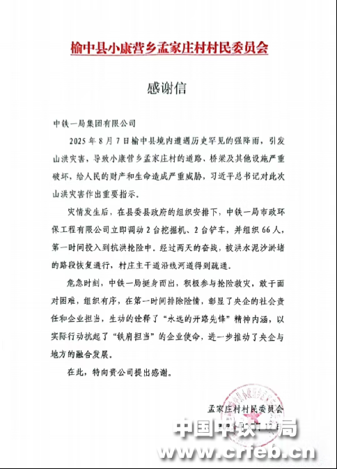 8月13日,中鐵一局市政環(huán)保公司歷經(jīng)3天的奮戰(zhàn),順利完成榆中縣小康營鄉(xiāng)孟家莊村的道路清淤,公司承接的榆中縣搶險救災(zāi)第一階段道路搶通任務(wù)也宣告完成。孟家莊村村民委員會特贈送錦旗并發(fā)感謝信,感謝中鐵一局挺身而出,積極參與搶險救災(zāi),生動詮釋“永遠的開路先鋒”精神內(nèi)涵,扛起“鐵肩擔(dān)當(dāng)”的企業(yè)使命。