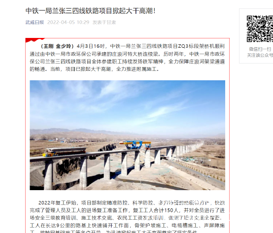 武威日報報道:中鐵一局蘭張三四線鐵路項目掀起大干高潮!
