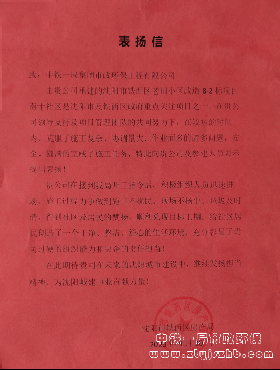 表揚信中指出:項目部在較短的時間內(nèi),克服了施工復(fù)雜、協(xié)調(diào)量大、作業(yè)面多的諸多困難,圓滿完成了施工任務(wù),在施工過程中做到了施工不擾民、現(xiàn)場不揚塵、垃圾及時清,給社區(qū)居民創(chuàng)造了一個干凈、整潔、舒心的生活環(huán)境,充分彰顯了過硬的組織能力和央企的責(zé)任擔(dān)當(dāng)。