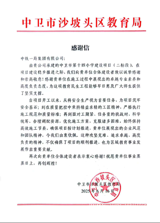 6月16日,中衛(wèi)市沙坡頭區(qū)教育局向中鐵一局集團(tuán)中衛(wèi)市第十四小學(xué)建設(shè)項(xiàng)目(二標(biāo)段)發(fā)來感謝信,對項(xiàng)目在中衛(wèi)市沙坡頭區(qū)重點(diǎn)教育工程建設(shè)中展現(xiàn)出的卓越履約能力、創(chuàng)新攻堅精神和高度責(zé)任感給予充分肯定。
