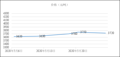 2020年5月份國內(nèi)建筑鋼價(jià)震蕩上行,截止5月底,西本鋼材指數(shù)收在3810,較上月末上漲100元/噸。下圖為西安地區(qū)螺紋鋼HRB400EФ20mm價(jià)格走勢。